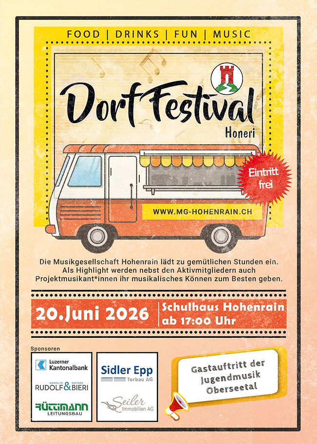 Am Samstag, 20. Juni 2026, ist es wieder so weit: Hohenrain feiert! Ab 17.00 Uhr verwandelt sich das Areal beim Schulhaus Hohenrain in einen lebendigen Treffpunkt für Jung und Alt – mit Musik, Genuss, Begegnungen und ganz viel Dorffest‑Stimmung. Das Dorf Festival Honeri geht in die nächste Runde.